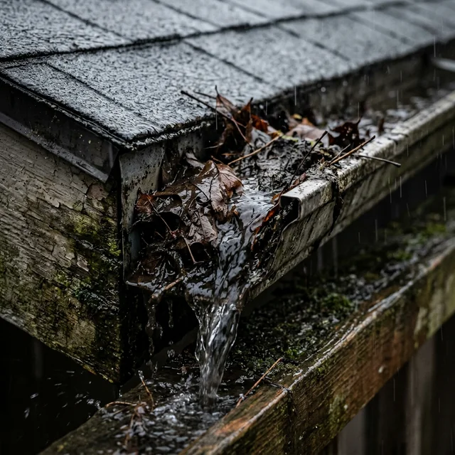 - Clogged gutters overflowing during rainstorms